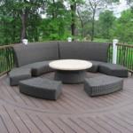This take on a curved deck design is all about the seating, which is inviting without being too plush. The basket weave pattern of the seating and the table pedestal give it a nice combination indoor furniture/outdoor patio furniture feel. The fact that all of the elements are movable is a big plus for entertaining.