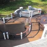 This new angle of a previously viewed design proves that there is no such thing as too many curves in a curved deck design. Multiple levels flowing one into the other as well as a nice curved paver stone patio at the bottom with a low curved stone wall with stone capper for perfect seating.