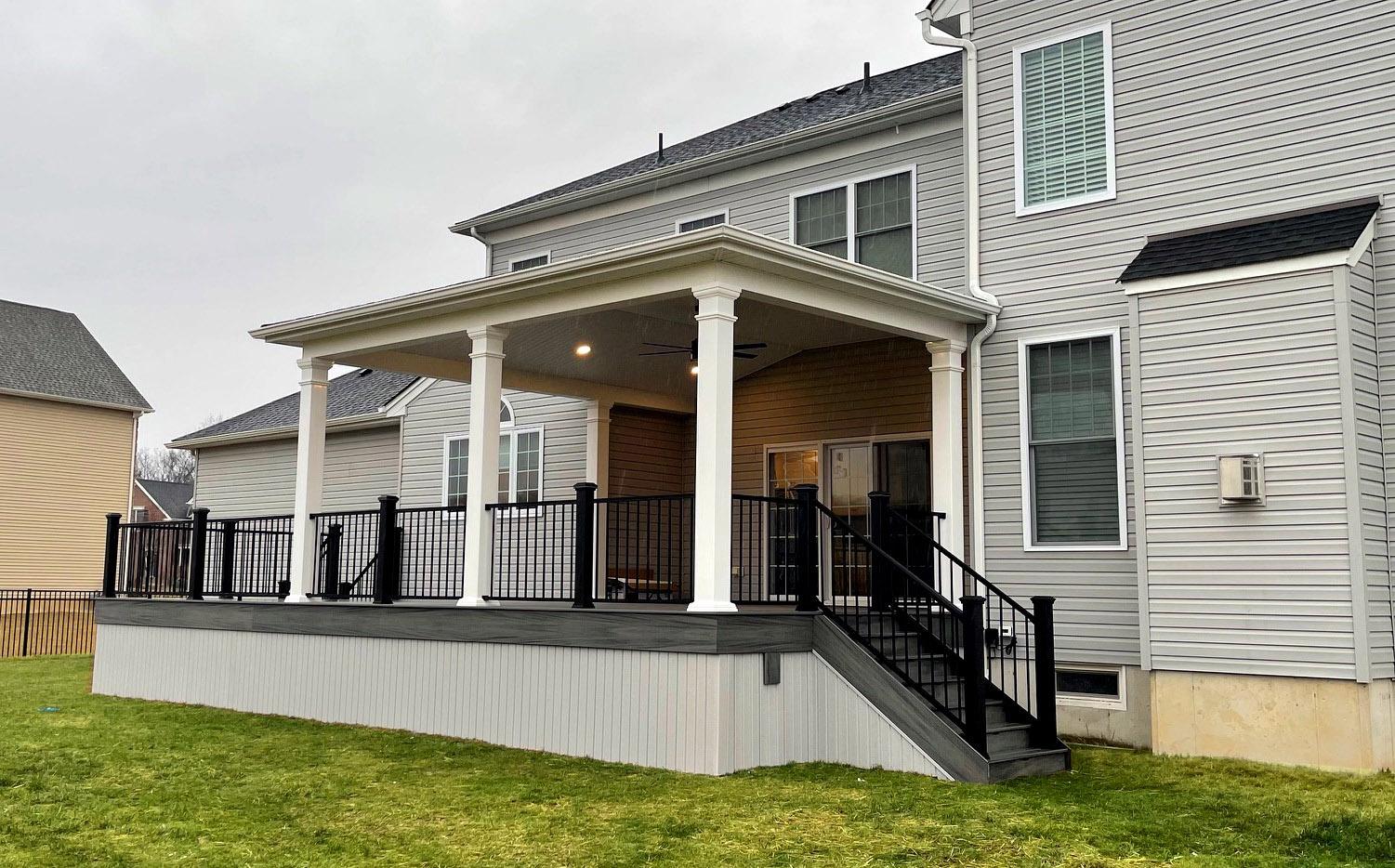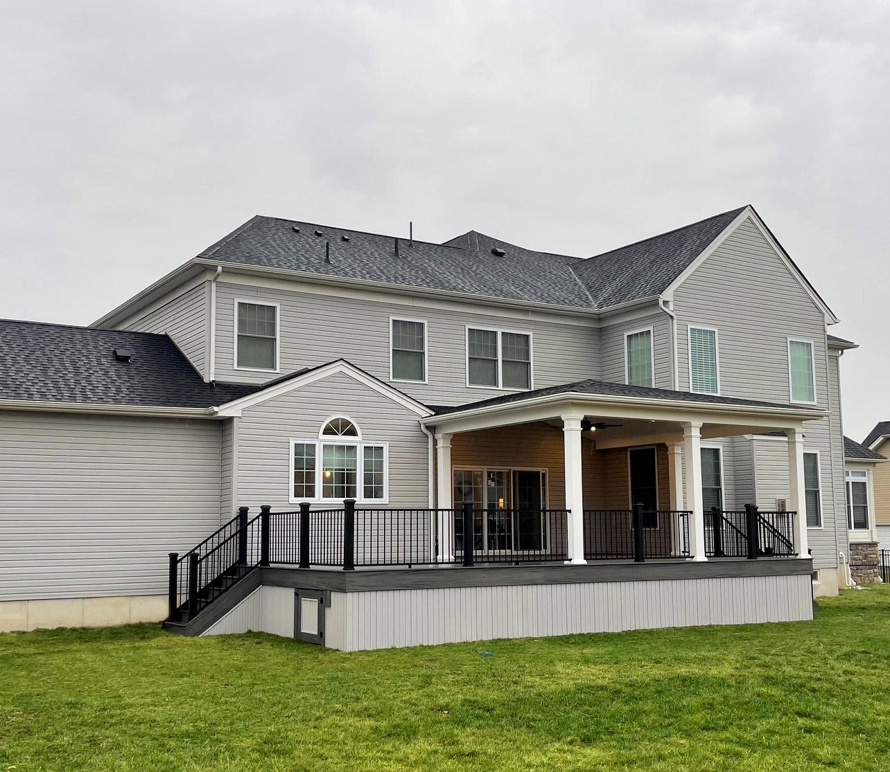 Trex transcend decking in island mist with trex signature railing (aluminum) in black – custom “a-frame” roof with white vinyl columns. The ceiling finished with white vinyl soffit and white gutters. The bottom skirting finished with vinyl sterling gray soffit.