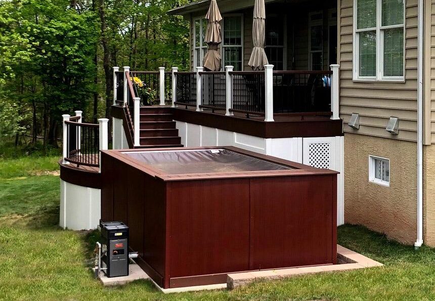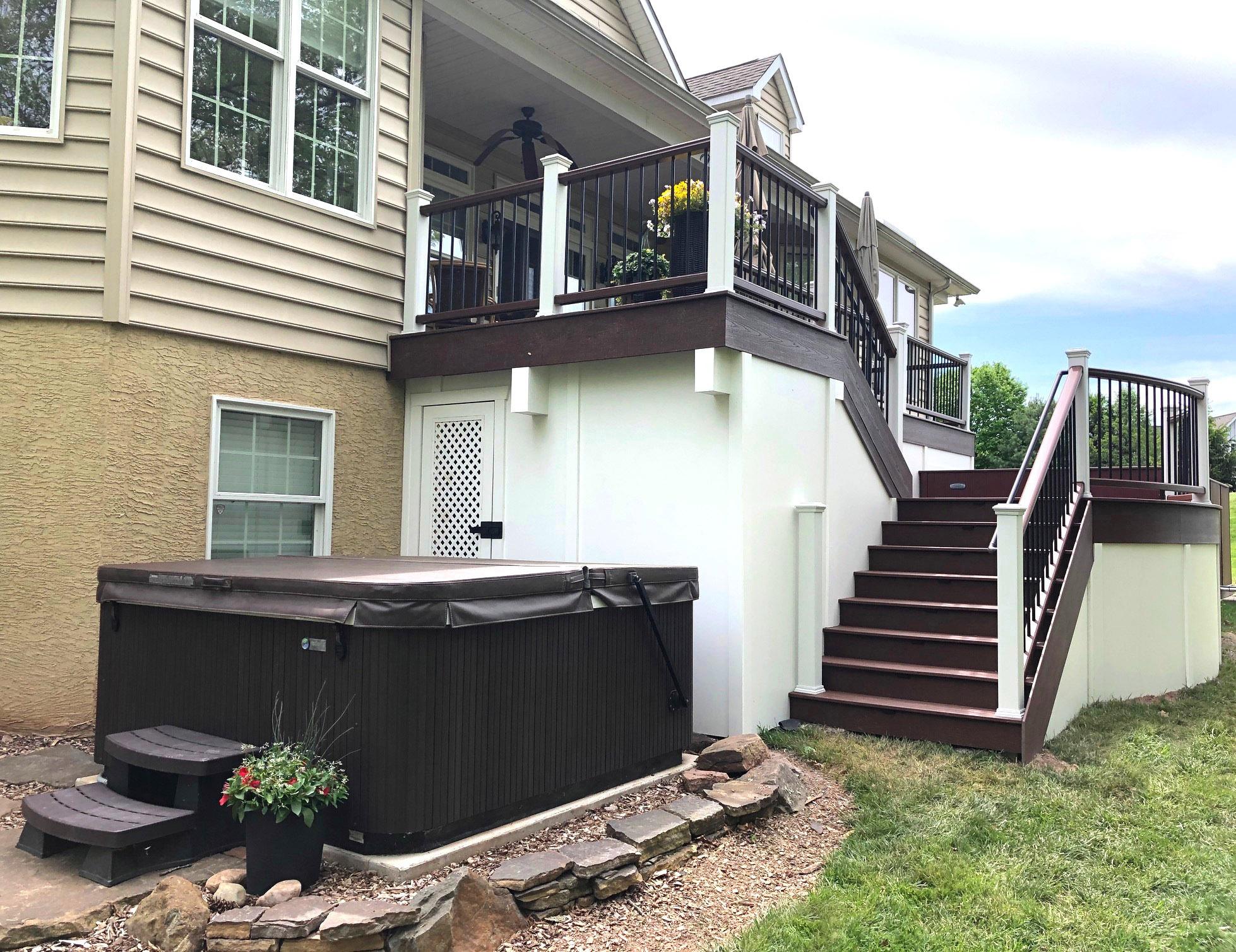 Trex transcend decking in fire pit with transcend railing also in fire pit with black round aluminum balusters and white post. This project features a custom swim spa as well as a hot tub. There is also a custom storage space below – finished with azek PVC walls.