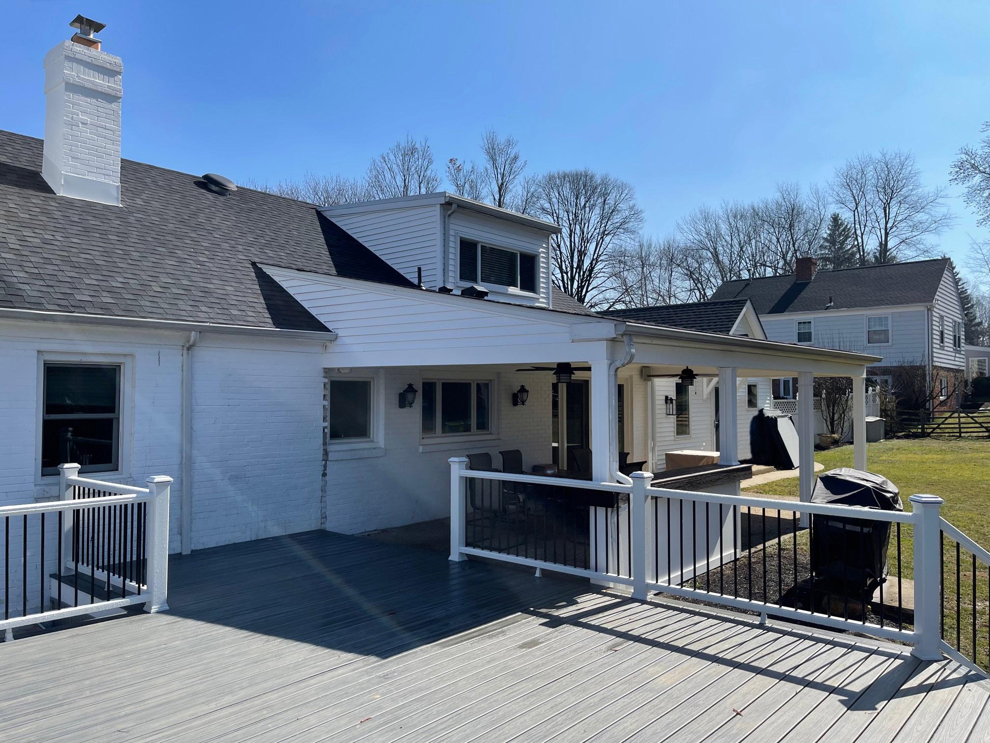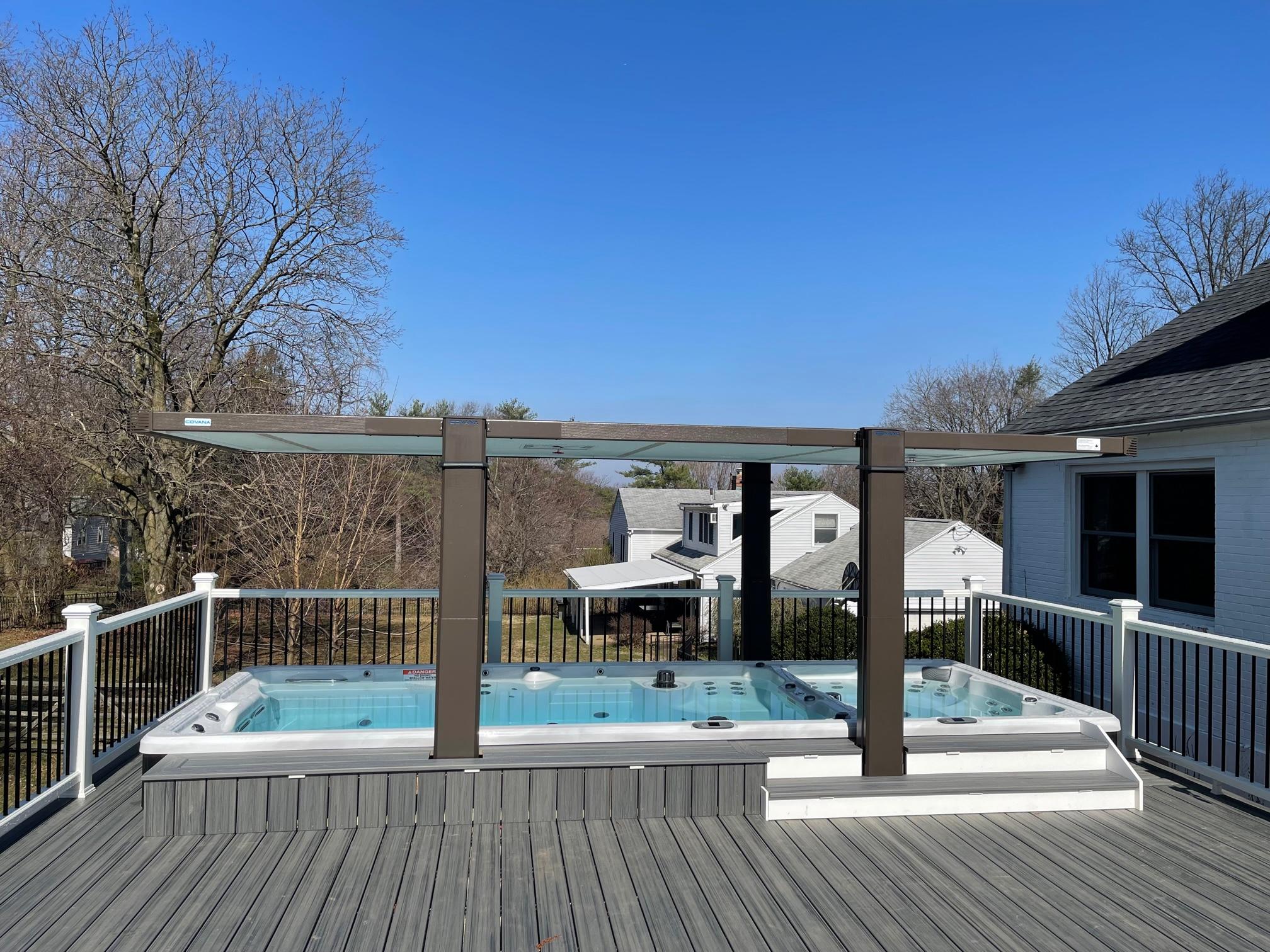 Trex transcend island mist decking with trex transcend railing in white with black aluminum balusters. Custom built-in swim spa with custom seat alongside.