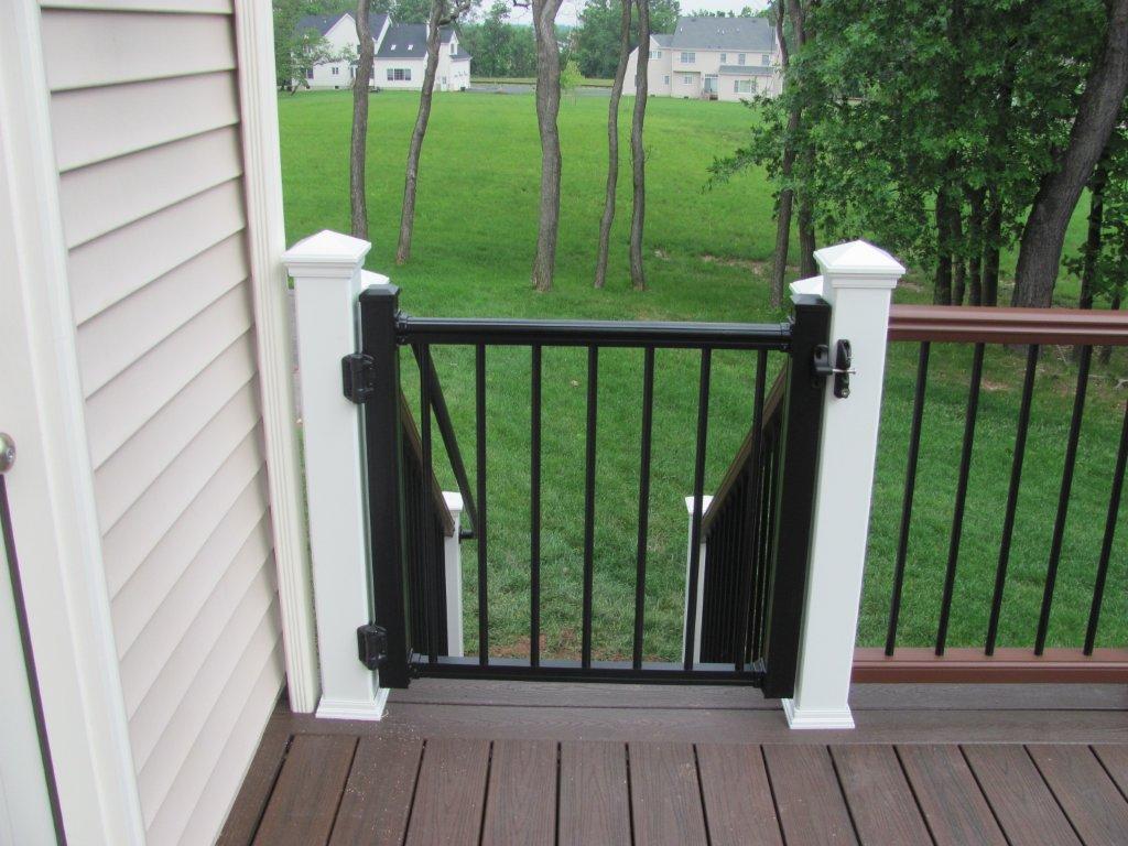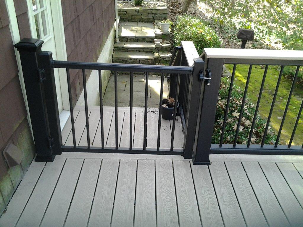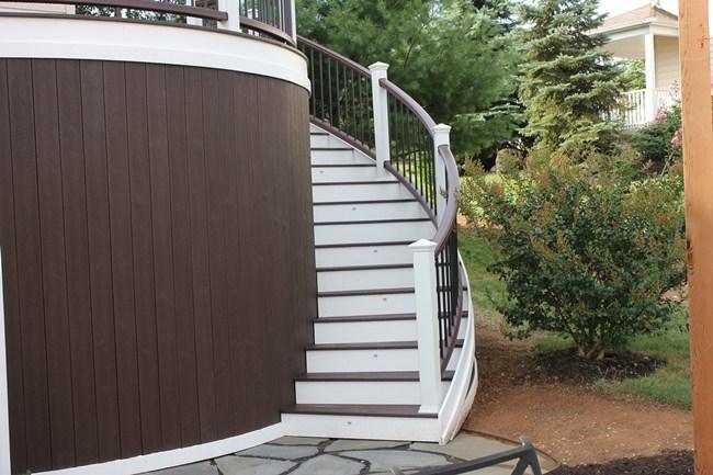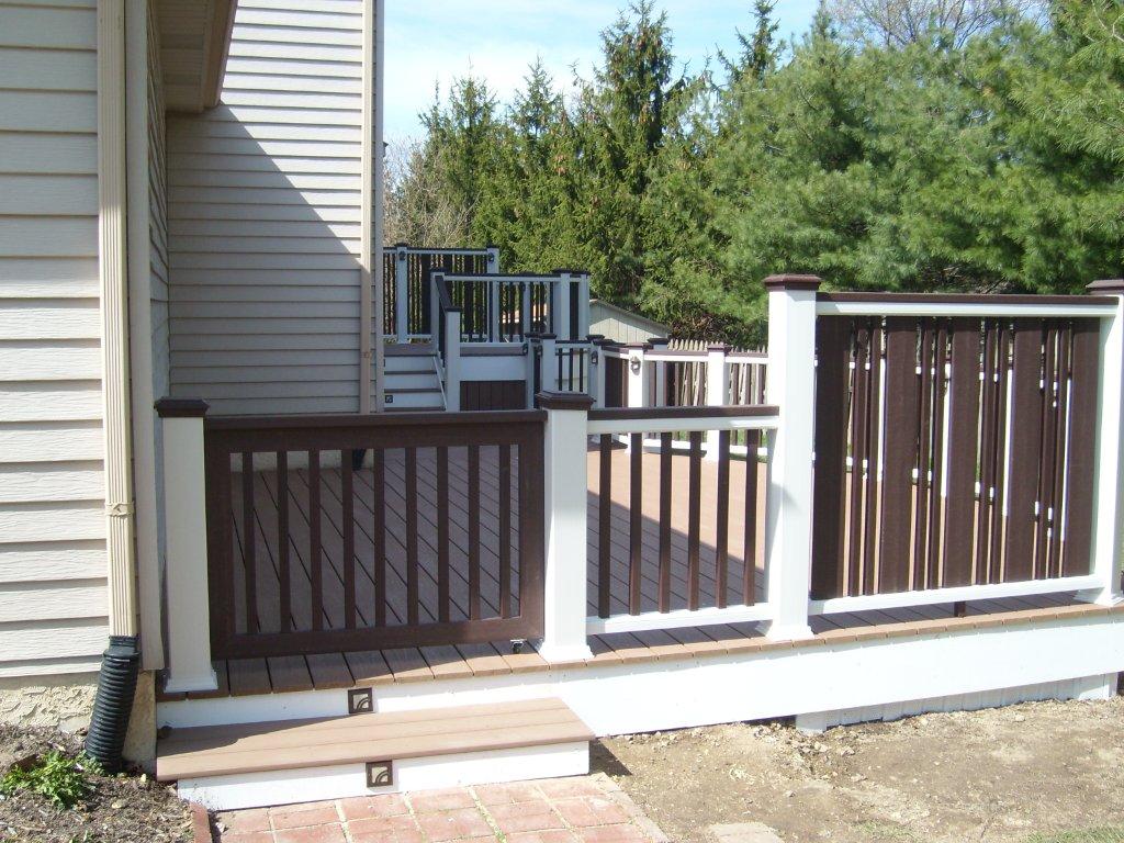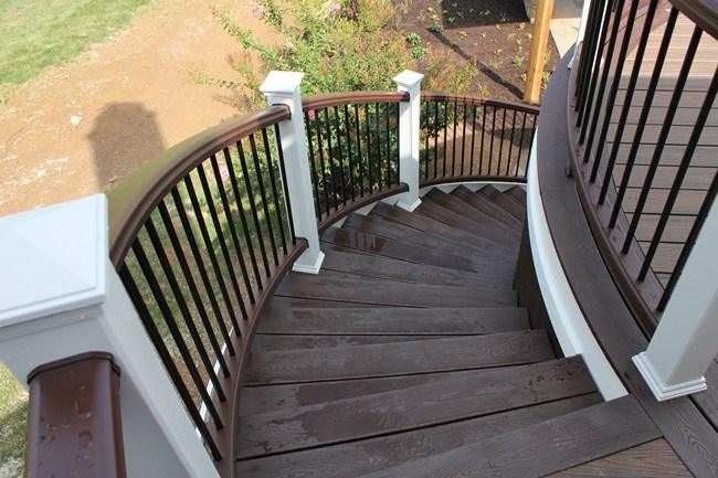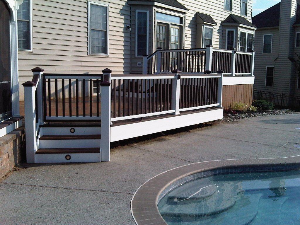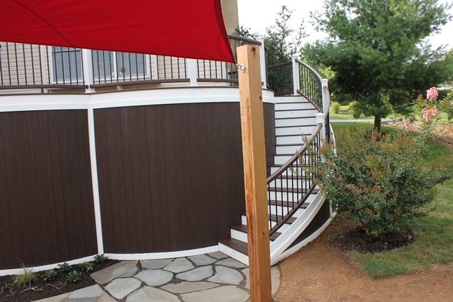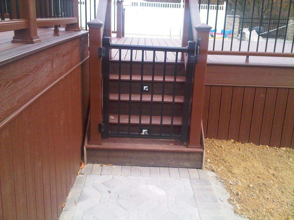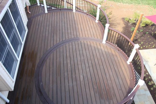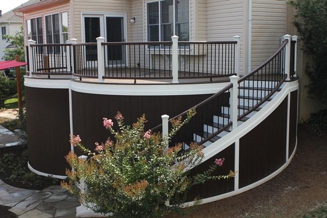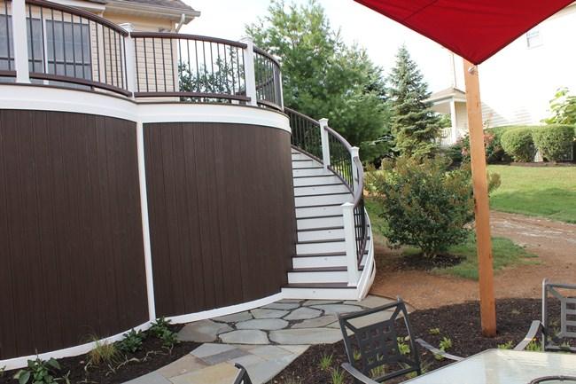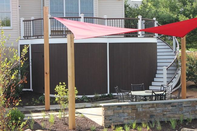 Trex Spiced Rum decking with Trex Signature Rod Railing (black), custom roof with black trim, outdoor kitchen and entertainment wall with Eldorado Stone Veneer (Banff Cliffstone).