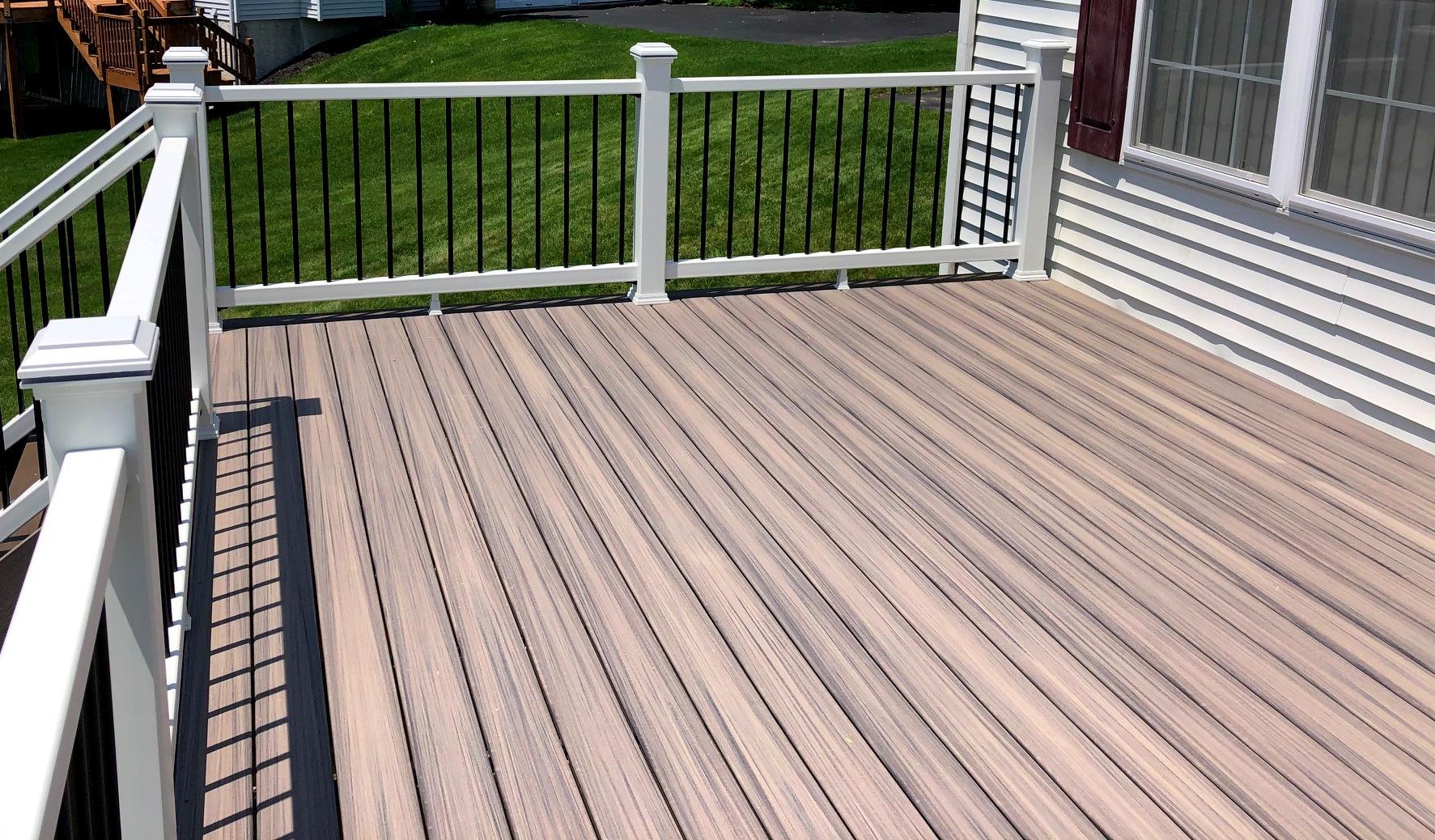 Trex enhance decking in rocky harbor with coastal bluff border. Trex select railing in white with black alum balusters.
