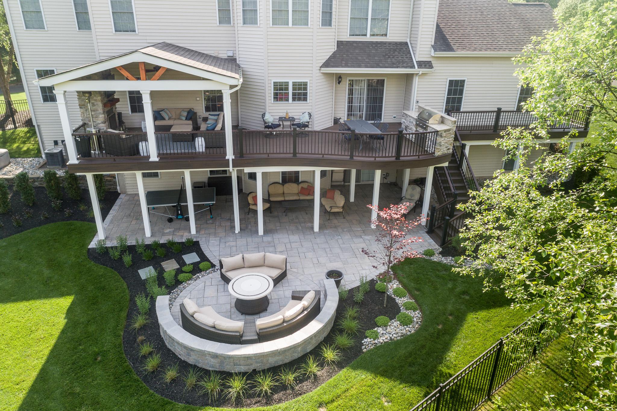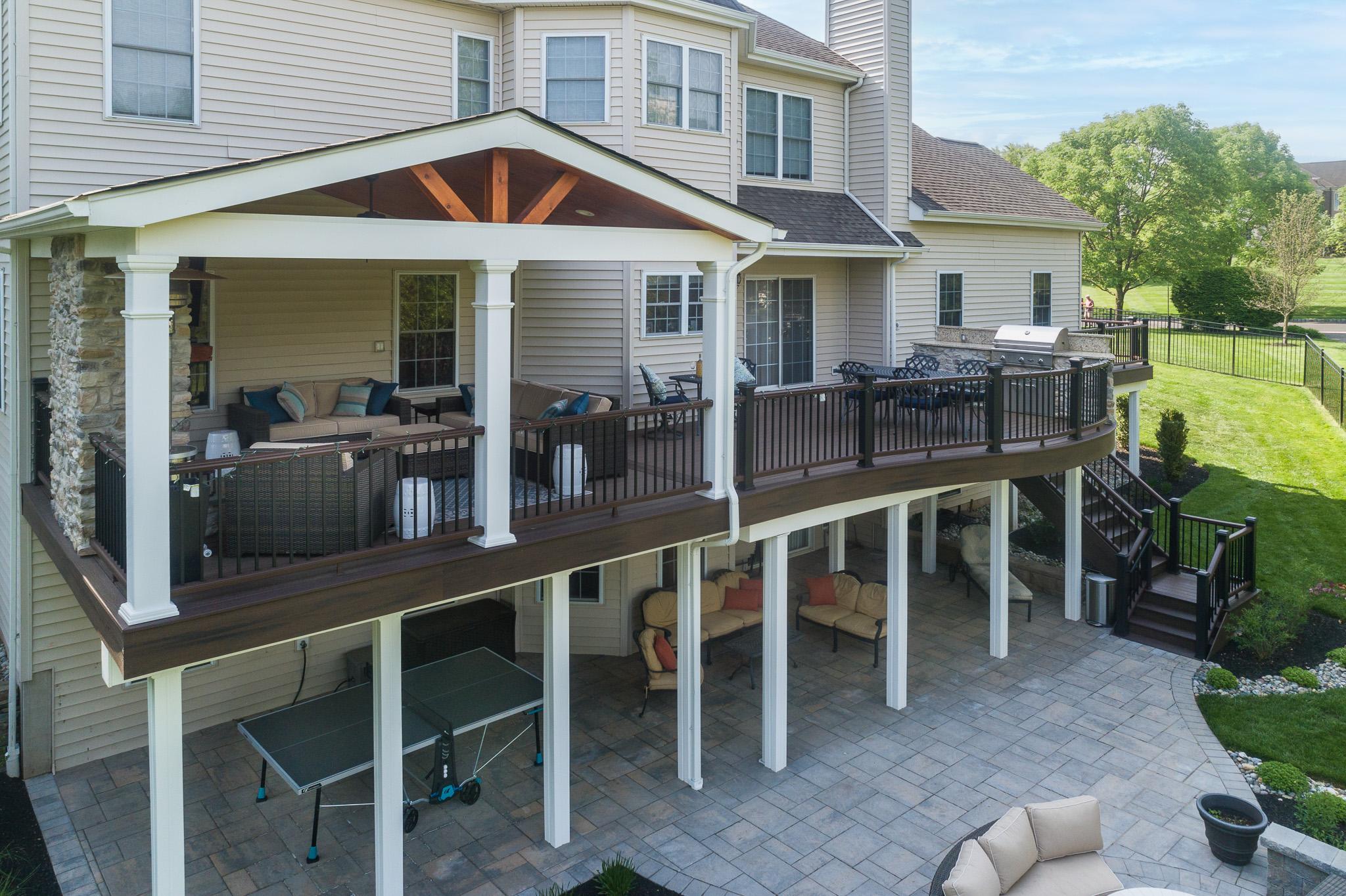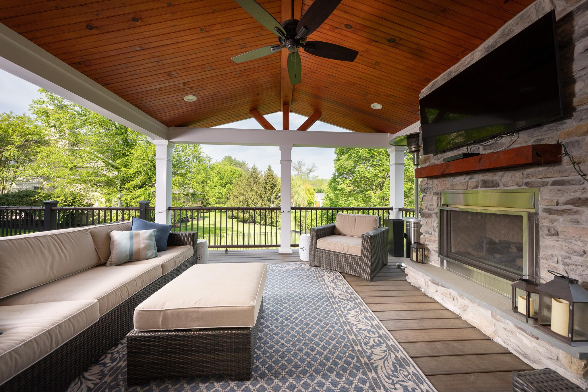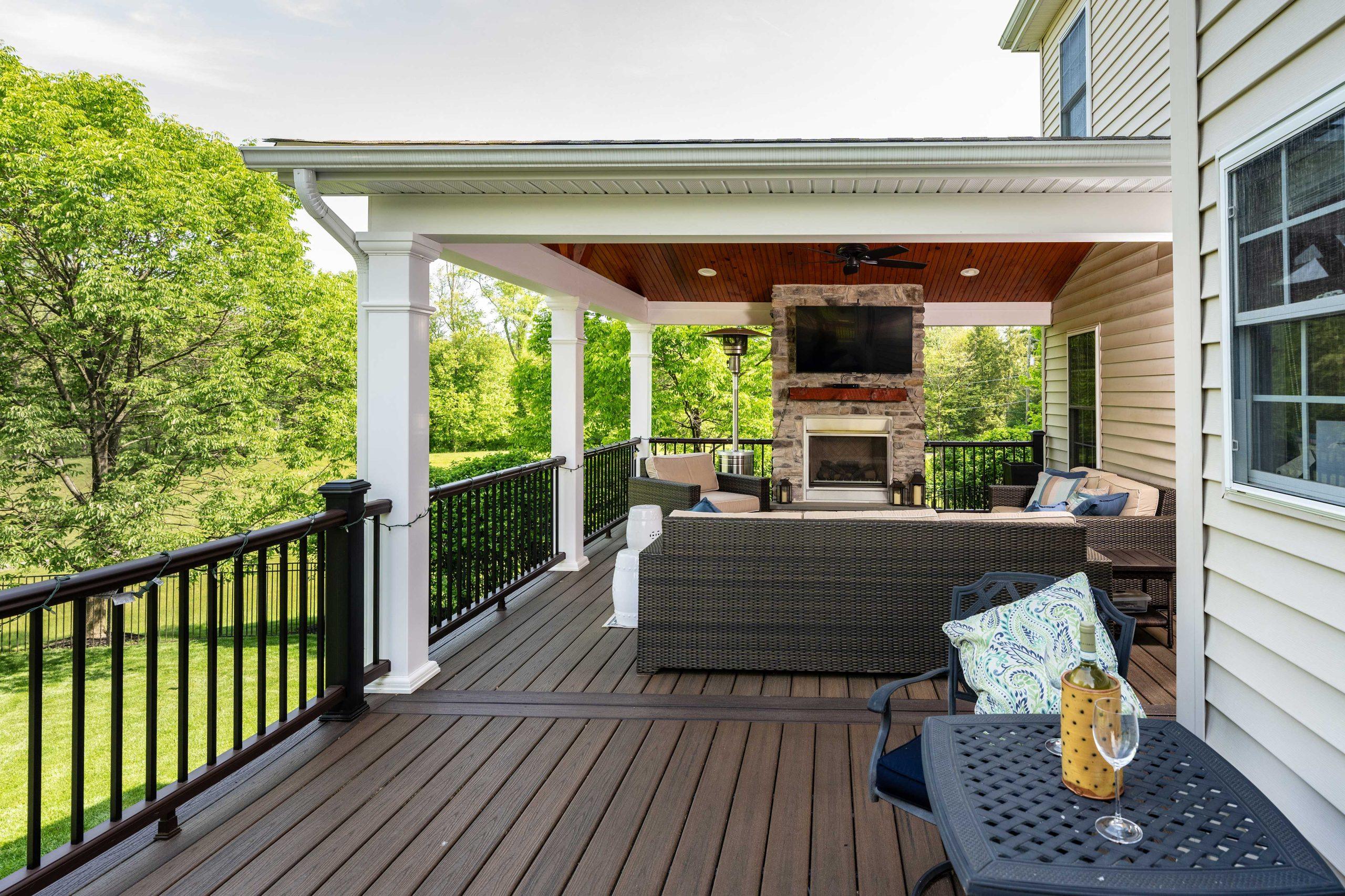 Trex Spiced Rum decking with Lava Rock border, black posts, vintage lantern rail, and custom roof. Trex rain scapes (water diversion system) was installed. The Grill Island is an outdoor kitchen. The fireplace is stone veneer – Eldorado Crescent Peak.