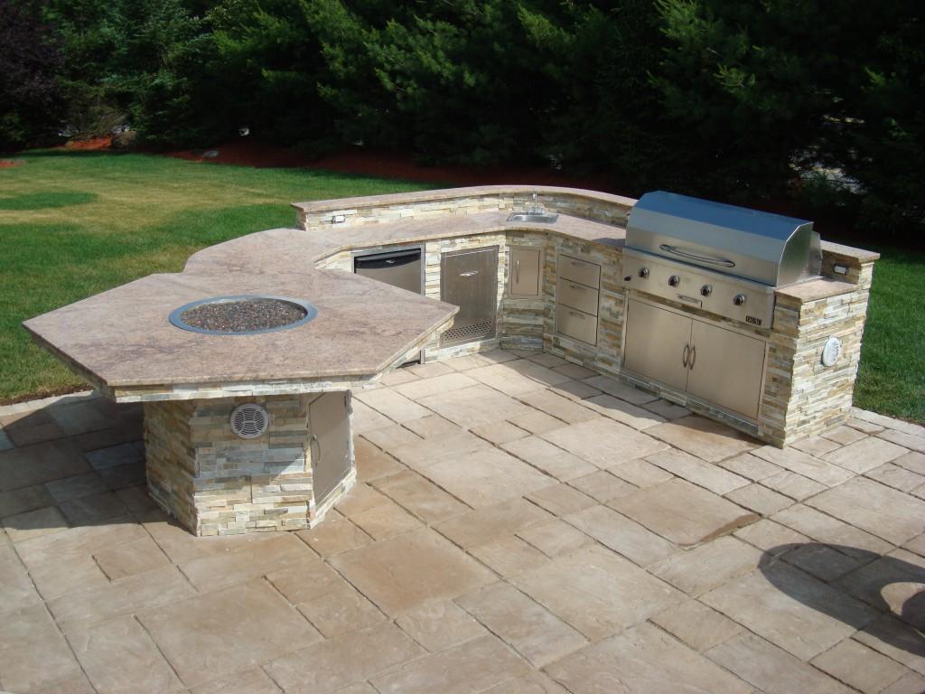 Outdoor kitchens are super convenient for those who like to entertain and cook a lot. Instead of having to be inside while your guests are outside enjoying each other’s company and the fresh air, an outdoor kitchen allows you to mingle while you cook. In this particular design, the table on the end provides a nice intimate dining area around a small, cozy fire. Check out more options for outdoor kitchens.