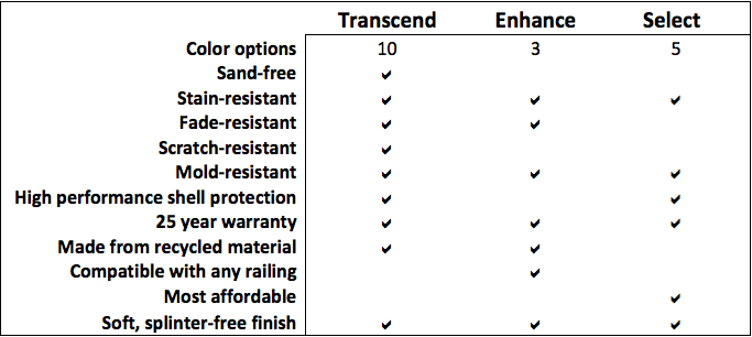 Trex deck design comes in three types: Select, Enhance, and Transcend. You can’t go wrong with any type of decking from Trex, but we’ve created a chart to help you decide which type is best for your needs.